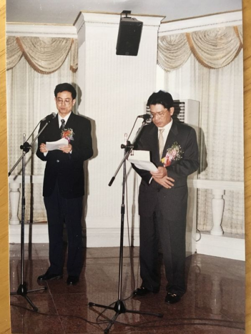 (1999年,美的东芝技术合作签字仪式中,菜农担任翻译。何享健(右),菜农(左))