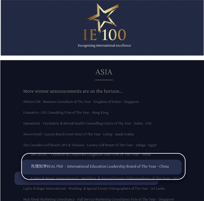 近日,国际知名奖项International Elite 100 Awards正式公布“International Education Leadership Brand of the Year-China”(年度国际教育领军品牌)获奖结果。先理知学REAL PhD凭借其在海外博士申请领域的持续深耕与体系化服务,成功入选该榜单。此次获奖不仅是品牌国际化发展的阶段性成果,也折射出其在国际教育专业服务领域逐渐形成的口碑影响力。
