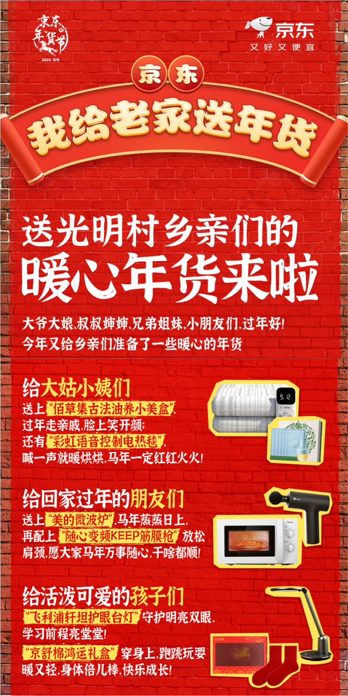 1月26日,正值腊八节,京东正式开启2026年“我给老家送年货”活动。当日,有网友发现京东集团创始人、董事局主席刘强东再度为其老家江苏宿迁来龙镇光明村的乡亲们备上暖心年货。京东APP“我给老家送年货”活动页面显示,本次刘强东为光明村的村民下单了超万件年货,家用大件、暖心小件应有尽有,在琳琅满目的年货品类中,护肤套装、筋膜枪、红品袜子等服饰、美妆、运动好礼,充满了暖心的生活温情,已经成为大家争相入手的“光明村同款”热门好物。