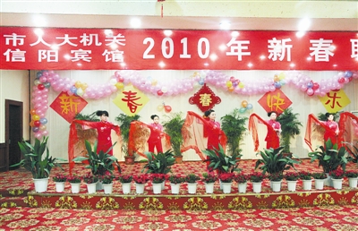 2月5日夜晚,市人大常委会机关和信阳宾馆共同举办了“2010年迎新春联欢晚会”。晚会以大家自编自演的舞蹈、独唱、合唱等节目热情讴歌了我市在过去一年里所取得的辉煌成就,展望了对信阳发展宏伟蓝图的美好憧憬。市人大常委会主任姚铁璜、副主任李军等兴致勃勃地观看了演出。图为晚会现场。本报记者 黄 铎 摄 |