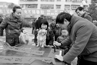 日前,浉河区文联、浉河区民政局组织部分书法家,带着笔墨纸砚来到五星路报晓新村社区,开展义务送春联活动,将新春的祝福送到市民家中。图为活动现场。本报记者 方慧玲 摄