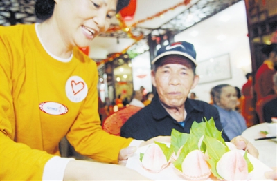 2月7日,志愿者为老人送上寿桃。