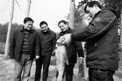 日前,浉河区十八口水库养殖专业合作社理事长聂保国(右二)和吴家店镇领导一起喜看收获的“大鱼”。该区十八口水库养殖专业合作社于去年成立,采取“旅游+垂钓+餐饮”的一体化发展模式。2009年,该合作社产鱼30多万斤,产值100多万元。 本报记者 秦 旭 摄