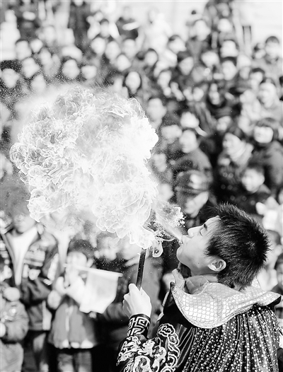 2月20日,在火神台古庙会上,一位民间艺人在表演“口中吐火”。