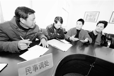 3月11日,在福建省漳平市赤水镇香寮村村部,赤水镇司法所所长刘正南(左一)现场调解村民的林地林木权属纠纷。赤水镇2009年试行“农事村办”机制,镇干部每周轮流进村办公。一年来,赤水镇林业、农技、司法、国土等部门先后50多次深入辖区乡村开展服务。