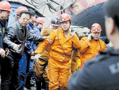 | 4月5日,救援人员将获救矿工抬出井口。 新华社记者 燕 雁 摄 |