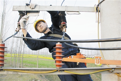 光山县电业局抓住天气晴好的有利时机,加紧进行春检消缺工作。图为日前该局北向店供电所工作人员对台区消缺时的情景。