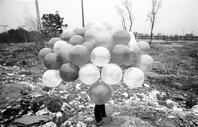 图⑥:2010年2月5日,巴基斯坦伊斯兰堡市郊,十四岁的坦维尔拿着一把气球在路边等着顾客光顾。