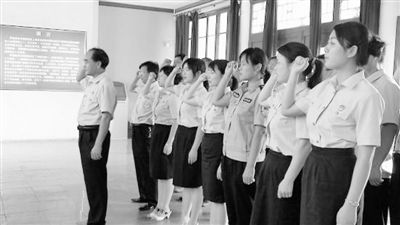 为庆祝建党89周岁, 7月1日,光山县法院组织部分党员、预备党员和入党积极分子,到新县缅怀革命先烈,接受革命传统教育。图为该院干警在鄂豫皖苏区首府革命博物馆内重温入党誓词时的情景。