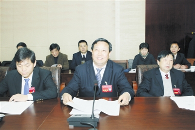 市人大代表、新县县长杨明忠(中)在审议政府工作报告。 |
