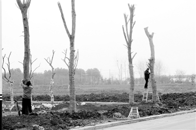 近年来,潢川县着力构建集育种、栽培、加工、销售为一体的花木产业链,实现花木园艺产业和县域经济可持续发展。图为该县白店乡万亩花木园区的园艺工人正在对树木进行春季养护。 本报记者 孟 磊 摄