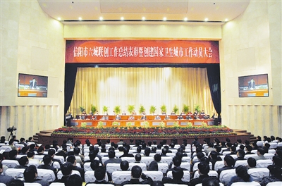 大会对在创建国家园林城市工作中做出突出贡献的浉河区政府等15个单位颁发了红旗,对2010年度六城联创工作县城考评第一名的新县、乡镇考评前10名的新县吴陈河镇等19个乡镇颁发了红旗。