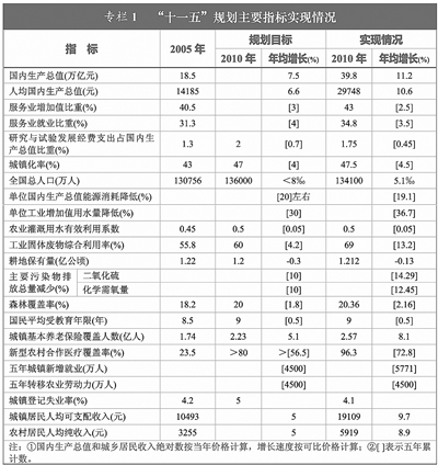 “十一五”时期是我国发展史上极不平凡的五年。面对国内外环境的复杂变化和重大风险挑战,党中央、国务院审时度势,团结带领全国各族人民,坚持发展这个党执政兴国的第一要务,贯彻落实党的理论和路线方针政策,实施正确而有力的宏观调控,充分发挥我国社会主义制度的政治优势,充分发挥市场在资源配置中的基础性作用,使国家面貌发生新的历史性变化。我们有效应对国际金融危机巨大冲击,保持了经济平稳较快发展良好态势,战胜了四川汶川特大地震、青海玉树强烈地震、甘肃舟曲特大山洪泥石流等重大自然灾害,成功举办了北京奥运会、上海世博会和广州亚运会,胜利完成了“十一五”规划确定的主要目标和任务。综合国力大幅提升,2010年国内生产总值达到39.8万亿元,跃居世界第二位,国家财政收入达到8.3万亿元;载人航天、探月工程、超级计算机等尖端科技领域实现重大跨越。经济结构调整步伐加快,农业特别是粮食生产连年获得好收成,产业结构优化升级取得积极进展,节能减排和生态环境保护扎实推进,控制温室气体排放取得积极成效,各具特色的区域发展格局初步形成。人民生活明显改善,就业规模持续扩大,城乡居民收入增长是改革开放以来最快的时期之一,各级各类教育快速发展,社会保障体系逐步健全。体制改革有序推进,农村综合改革、医药卫生、财税金融、文化体制等改革取得新突破,发展活力不断显现。对外开放迈上新台阶,进出口总额位居世界第二位,利用外资水平提升,境外投资明显加快,我国国际地位和影响力显著提高。社会主义经济建设、政治建设、文化建设、社会建设以及生态文明建设取得重大进展,谱写了中国特色社会主义事业新篇章。五年取得的成绩来之不易,积累的经验弥足珍贵,创造的精神财富影响深远。