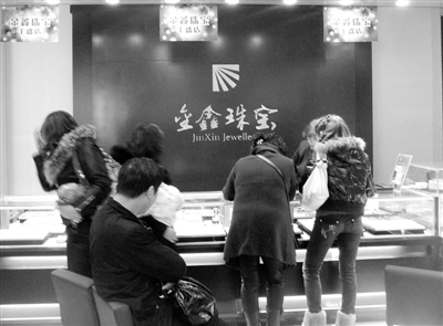 图为顾客在金鑫珠宝千盛店选购珠宝首饰时的情景。汪 呈 摄 |