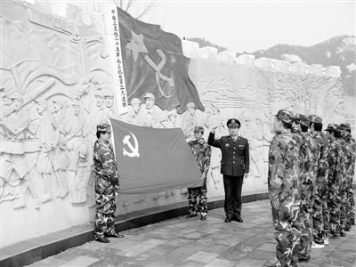 为培育和践行当代军人的核心价值观,今年以来,罗山县人武部采用邀请当地老红军讲述战斗故事、组织参观红二十五军长征出发地何家冲、重温入党誓词等形式,使干部职工、民兵预备役人员不断端正思想认识。图为该县人武部组织民兵党员参观红二十五军长征出发地,重温入党誓词时的情景。冷 歆 席化力 摄