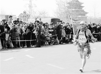 3月27日,参加郑开国际马拉松赛的宁夏选手陈军在比赛中行进。当日,手举绿色“低碳”旗子、身上裹着青菜绿叶的陈军在郑开国际马拉松赛中十分耀眼,多处赢得掌声和喝彩。陈军自幼喜欢跑步,多次参加马拉松等长跑运动,以别致的造型宣传低碳环保。 新华社记者 赵 鹏 摄
