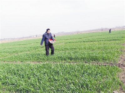 图为光山县一农民正在为麦田施肥。本报记者 赵雪峰 摄 |