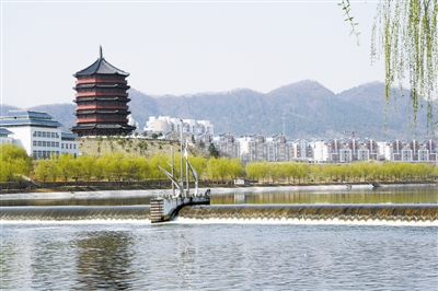 | 隔河望去,茗阳阁像一座圆形宝塔,大气磅礴。本报记者 方慧玲 摄 |