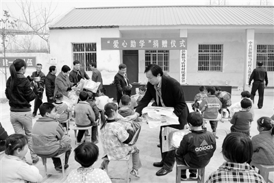 4月1日,市侨联主要负责人带领部分侨资企业负责人,到市委统战部选派干部柳海宝任职的罗山县彭新镇马店村,就茶产业发展、农民新村建设等进行考察。考察期间,侨资企业负责人为马店村捐款3万元,用于“爱心助学”及公益基础设施建设。图为“爱心助学”捐赠仪式现场。龚廷树 摄 |