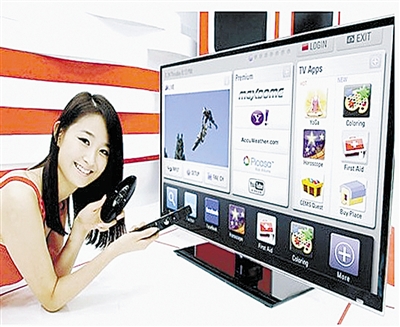 以Android平台为代表的智能电视正在兴起,统一界面、自主选择程序、App在线商店应用以及感应遥控等智能化家电产品,在Android平台基础上可以延伸出很多应用,不仅创维、康佳、三星等厂家近期发布了智能电视,就连在手机上大放光芒的苹果,也将推出Apple TV电视产品。图为工作人员正在演示Android平台的电视操作界面。