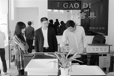 高帝洁具信阳分公司于4月18日落户信阳国际建材港。该公司系列产品有挂便器系列、立柱盆系列、儿童系列等十大系列,近百余种产品。图为消费者正在选购高帝洁具产品。