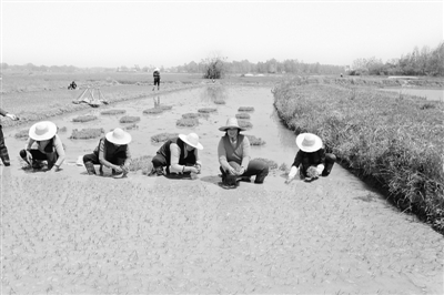 日前,潢川县谈店乡积极组织“钟点工”插秧队,帮助家中劳动力紧缺的计生户插秧,解除了他们的后顾之忧,受到广大计生户的好评。图为插秧队正在为该乡长岗村计生户李少英家移载秧苗时的情景。