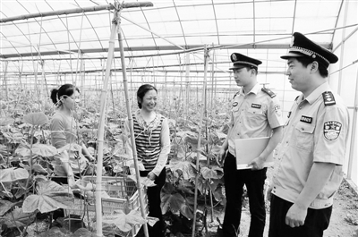 进入夏季后,为切实保护菜农的利益,潢川县公安局组织民警深入田间地头或蔬菜大棚开展巡逻走访,了解棚区治安情况,现场讲授防盗常识。图为日前该局民警正在一蔬菜大棚向菜农了解治安情况时的情景。