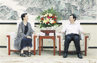 6月30日,市长郭瑞民亲切会见了广东莲池家具集团有限公司董事长王亚清一行,双方就企业到信阳投资兴业的相关事宜进行了沟通和交流。本报记者 胡瑜珊 摄