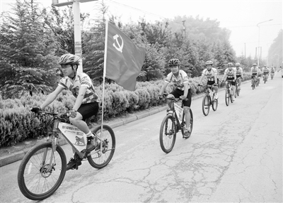 本报讯(记者 华 唯) 为庆祝建党90周年,中国邮政储蓄银行、江淮晨报联合举行了“骑行鄂豫皖 我的红色之旅”活动。活动中,由10名优秀大学生组成的自行车队,历时10天,跨越鄂豫皖3省12县。骑行车队7月10日从合肥市出发,12日抵达我市。
