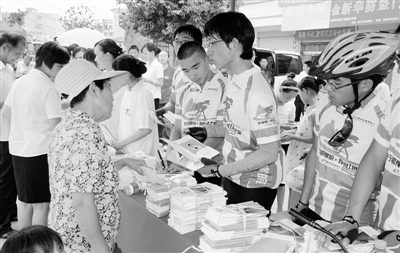 据介绍,这10名优秀大学生,是从中国科技大学、安徽大学等高校2000多名在校大学生中选拔出来的,其中有一名是我省洛阳籍学生。骑行车队全程将跨越鄂豫皖3省12县,途经我市固始、商城和新县3县。骑行车队7月10日从合肥市出发,途径安徽省六安市、金寨县、梅山县等革命老区,于7月12日中午抵达我市固始县,开始了他们在河南省的红色之旅。当天下午,骑行车队在固始县城关希望小学举行了捐赠活动。活动中,他们代表中国邮政储蓄银行信阳市分行和车队,为这里的孩子们捐赠了一批学习用品,并与孩子们开展了游戏互动活动。随后,同学们又赶往20公里外的固始县胡族镇,和当地邮政储蓄银行的工作人员一起,宣传邮政储蓄理财知识,受到了广大群众的欢迎。