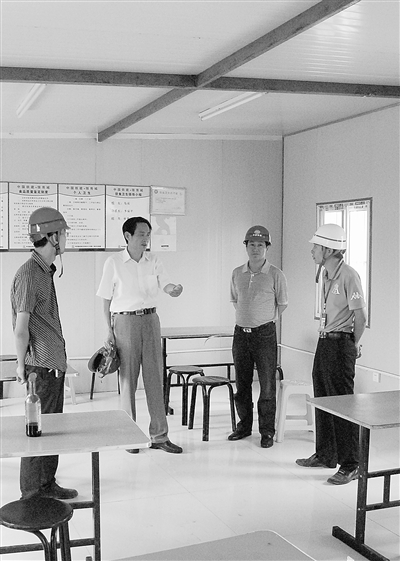 日前,市住建局局长程震南(左二)检查指导中心城区建筑工地民工食堂的创卫工作,并强调建筑工地创卫是当前的大局。