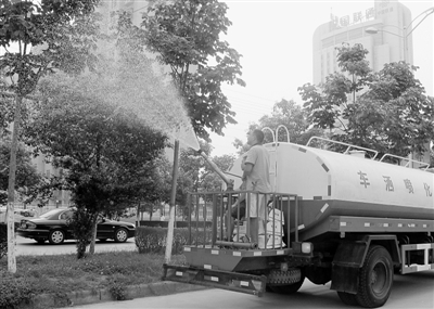 近期,我市中心城区的园林工人为行道树喷洒药物的情景。