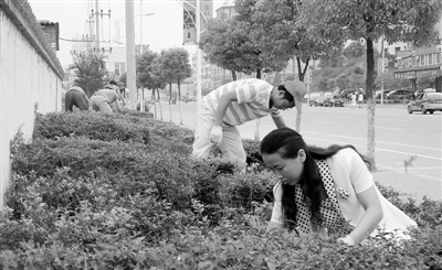 近日,平桥区平西办事处干部职工清除杂草的情景。