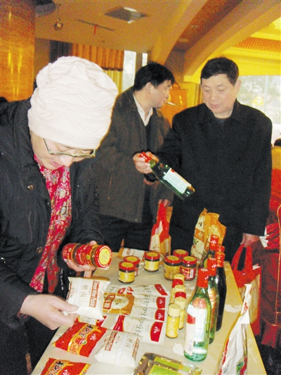 日前,上海好唯加食品有限公司与信阳市金城味业调料商行举办答谢宴会和新产品推介活动。图为消费者正在品鉴好唯加产品。