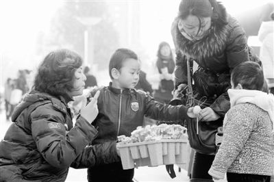 | 虽然已经进入了冬季,但严寒挡不住信阳奇卡早教中心的老师和小朋友们的浓浓爱心。日前的一天,她们早早来到胜利路步行街上,把自己手工制作的小工艺品拿出来进行义卖,并准备将义卖所得捐助给福利院的小朋友。不少过往的市民被孩子们感动,纷纷慷慨解囊相助。 本报记者 郝 光 摄 |