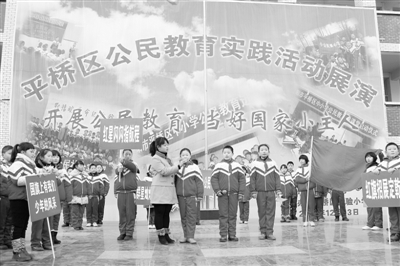 日前,平桥区实验小学举行了“开展公民教育,当好国家小主人”主题升旗仪式。升旗仪式设计了“红旗招展定乾坤”、“红星闪闪指航程”、“群星灿烂向着党”、“ 国旗上有我们少年的风采”4个课题。图为仪式现场。 邱 华 程丹彤 摄