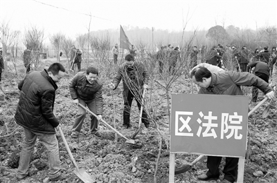 日前,浉河区法院组织干警参加了浉河区委、区政府统一开展的植树活动。图为该院干警正在植树时情景。