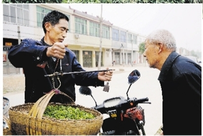 一名茶叶收购商在信阳新县收购茶农采摘的新茶(左图)。