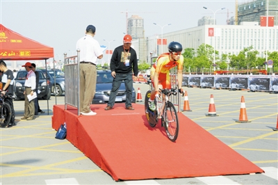 2012年全国公路自行车冠军赛个人计时赛昨日在羊山新区结束,男子组的冠、亚、季军分别被黑龙江队的薛明星、上海队的颜永生、吉林队的刘浩夺得;女子组比赛中,河南队的贾四丹勇摘桂冠,山东队的姜帆、梁敬分获二三名。上图为运动员在比赛中。下图为运动员在出发台出发。