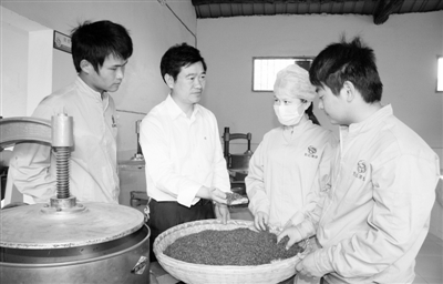 近日,信阳五云茶叶集团公司从安徽省请来专家进行指导,使该公司生产加工出的信阳红茶条形紧缩、金毫显露、乌黑发亮、汤色橙红,深受广大消费者的青睐。图为该公司领导在生产加工车间向技术人员了解红茶产品质量时的情景。