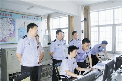 民警足不出户即可调取城区报警现场画面,实现“面对面”指挥调警;网上巡查即可掌控全城社会治安动态,实现打防管控一体化;回放视频资料即可调取案发现场信息,实现物证关联。——这就是息县城区数字高清治安视频监控系统。图为日前息县公安局局长郑磊、政委王明友深入该局视频监控中心检查工作。
