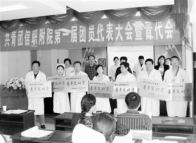 近日,共青团信阳职业技术学院附属医院第一届团员代表大会暨青年代表大会成功召开,选举产生共青团信阳职业技术学院附属医院第一届委员会。大会还对医院“第一届十大优秀青年”进行颁奖表彰,对医院7个“青年文明号”集体举行授牌仪式。