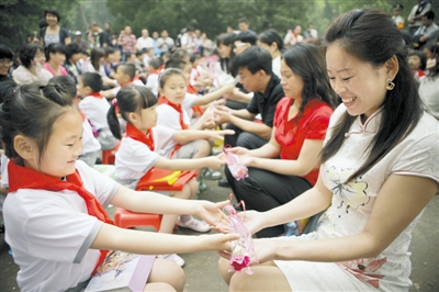 当日,北京市慧忠北里第二小学在北京日坛公园举行少先队入队仪式,100多名一年级小学生成为中国少年先锋队的新队员。当天又是母亲节,小学生的妈妈亲手为孩子戴上红领巾,新入队的小学生用少先队队礼和康乃馨表达对母亲的祝福。