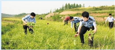 近日,光山县公安局禁毒民警针对罂粟种植隐蔽性强的特点,在辖区展开拉网式铲毒行动。图为该局槐店派出所民警正在拔除辖区内种植的罂粟。