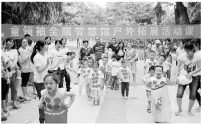 开发智力从幼儿抓起,日前,以强化幼儿智力培训为主旨的我市童领袖全脑智慧馆组织数十名幼儿在浉河公园开展户外拓展活动。图为活动一景。