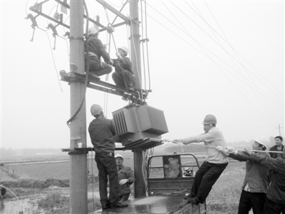 连日来,潢川县谈店乡供电所针对群众抗旱电力紧缺问题,战高温冒酷暑,无偿帮助群众进行电改,解决农村群众“三夏”用电难问题,受到干部群众的一致好评。图为该所员工在牌坊村为群众安装变压器时的情景。