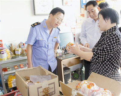 近期,信阳工业城食品安全委员会、信阳工业城工商分局联合开展了食品安全大检查活动,检查了辖区内各家超市、菜场,以及工业城中心学校和实验幼儿园的学生食堂,并对辖区内各类食品从加工到售后的各个环节作了全面调查,保证市民吃上安全、放心的食品。图为检查现场。李雁峰 摄