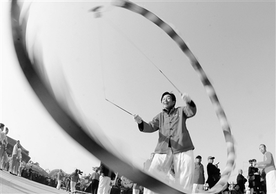 10月18日,在开封龙亭公园广场上,一位空竹爱好者在为游客表演。