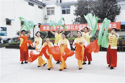 重阳节前夕,市委老干部局夕阳红合唱团为信阳富帮养老院的老人们送去了一台丰富多彩的文艺演出。合唱团的演员们满怀深情,齐声高唱《东方红》、《祖国颂》、《没有共产党就没有新中国》等一首首红色经典歌曲,赢得了老人们的阵阵掌声。图为慰问演出时的情景。