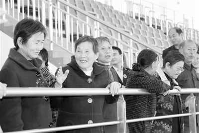10月23日,罗山县委宣传部负责同志带领县文明办、县志愿者协会、县义工协会的工作人员,为该县城关镇大园社区的马福凤、陈乃泽等30位“空巢老人”送去过冬的棉被和暖暖的祝福,并带老人们畅游县城新区,喜看罗山新变化。图为老人们在县体育馆参观时的情景。陈世军 摄